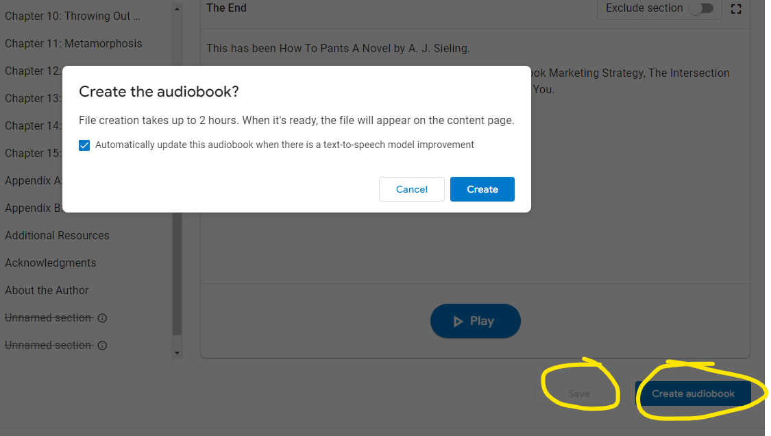 Once you’ve reviewed the entire book, selected your narrator, and made sure your sections are organized the way you want them, click save (if you haven’t already), and then click “Create Audiobook” on the bottom right.